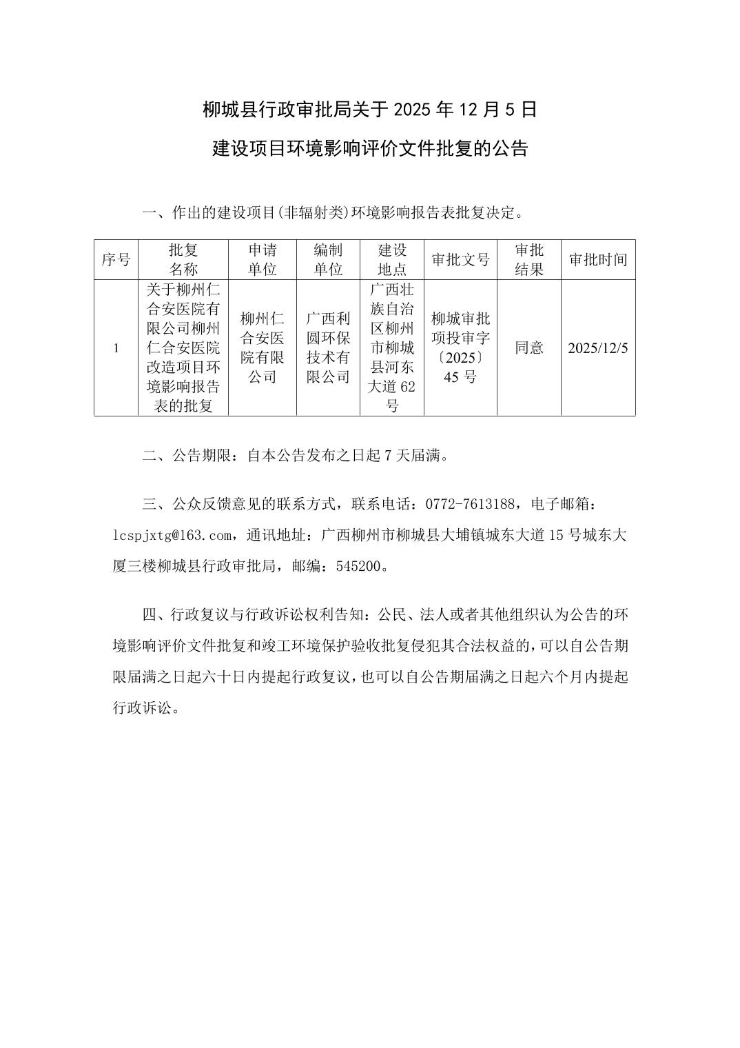 柳城縣行政審批局關(guān)于2025年12月5日建設(shè)項目環(huán)境影響評價文件批復(fù)的公告