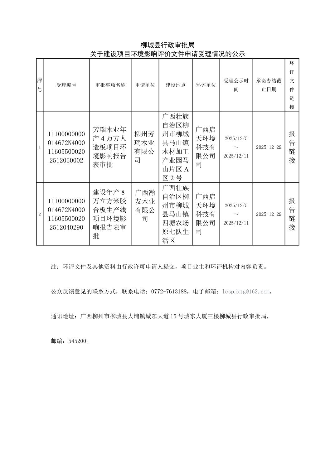 柳城縣行政審批局關(guān)于建設(shè)項目環(huán)境影響評價文件申請受理情況的公示