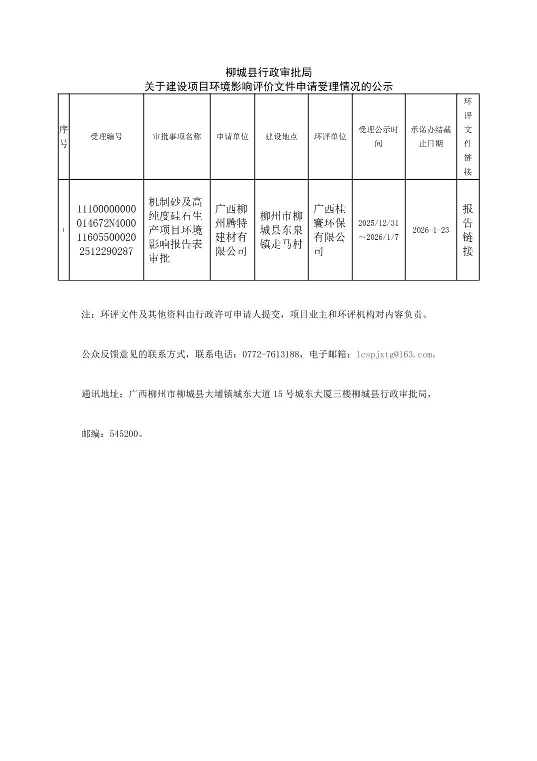 2025年12月31日柳城縣行政審批局關(guān)于建設(shè)項目環(huán)境影響評價文件申請受理情況的公示