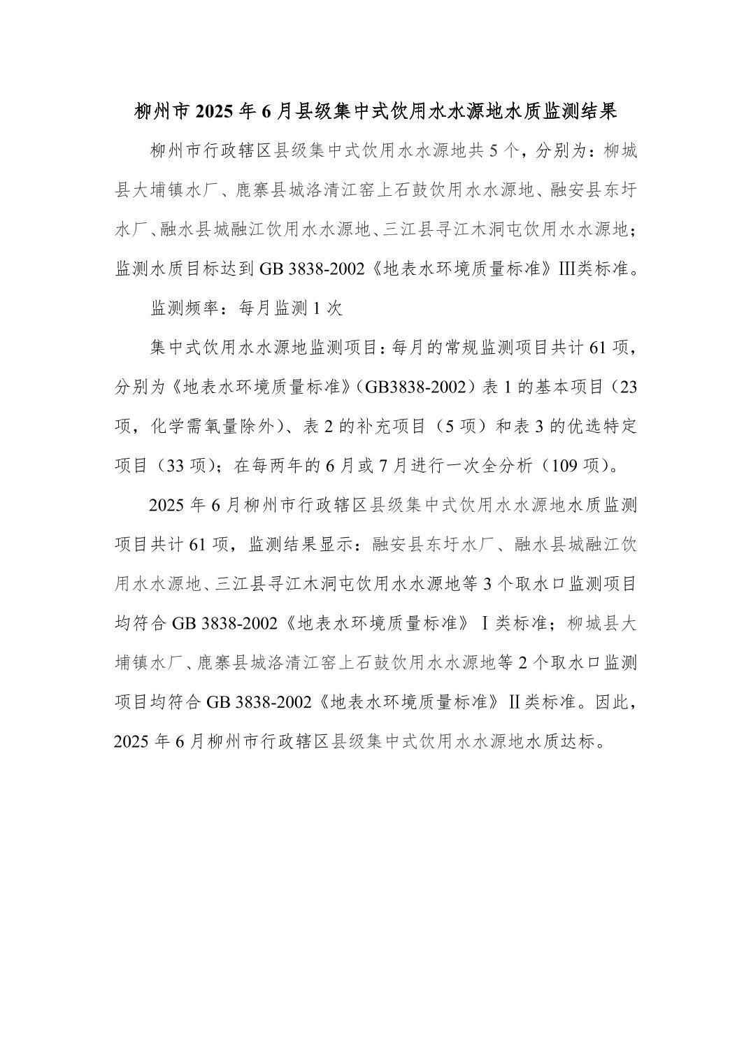 2025年6月份柳州市縣級飲用水質(zhì)量報告